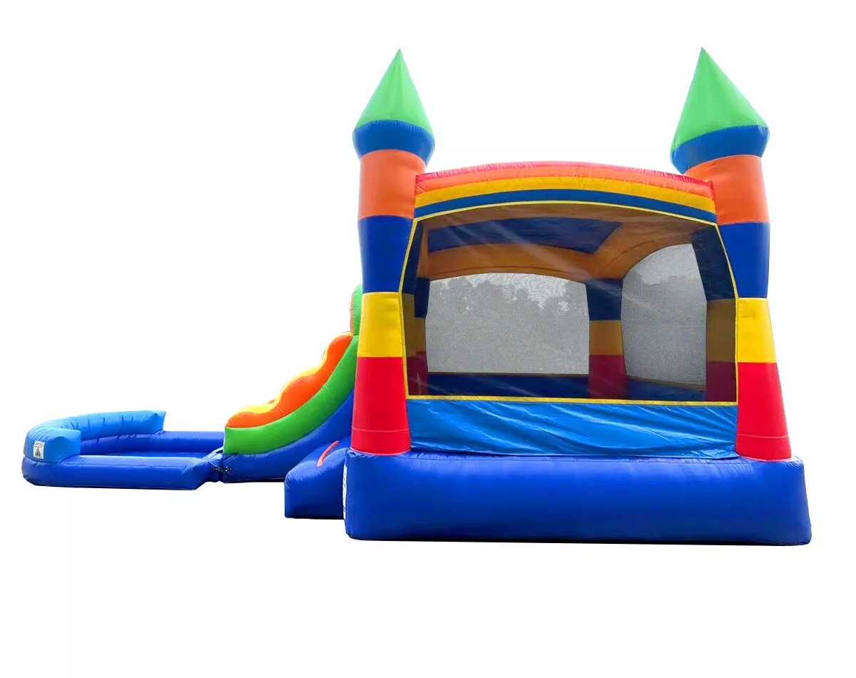 Inflatable Rainbow Bounce House Water Slide Combo with Pool is a great addition to all children's parties for jumping, bouncing, sliding, and splashing fun. The wet/dry slide attached to the jumping castle doubles the fun. Children climb up the stairs and slide down the cool blue mat with super soaking fun. Attach a garden hose to the bladder misting tube to maintain a wet environment. This inflatable wet/dry combo is easy to set up in a minute and comes with all the necessary accessories.