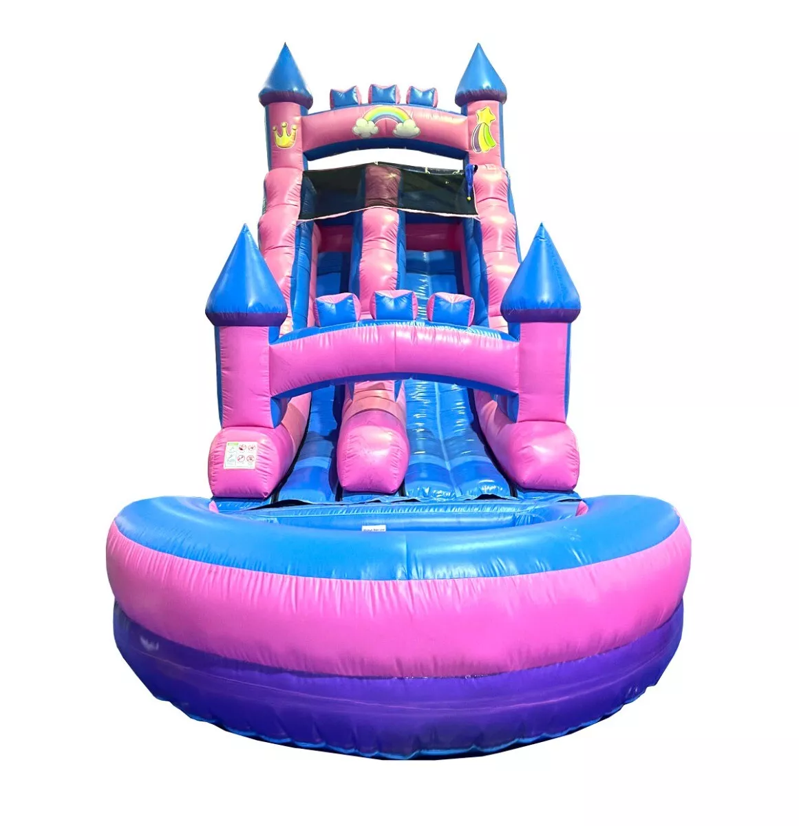 Crossover 25.5'L x 9'W x 15'H Wet/Dry Inflatable Slide is perfect for residential fun and budget-friendly enjoyment, while also serving as an excellent starter unit for rental businesses. This inflatable features durable 100% Commercial Grade PVC vinyl, rental-grade construction, up to quadruple stitching, and heat-welded seams for long-lasting use. It includes a built-in pool at the end of the slide for a refreshing splash landing. With its vibrant theme, it’s an ideal addition to family gatherings, birthday parties, school events, and casual backyard get-togethers.
